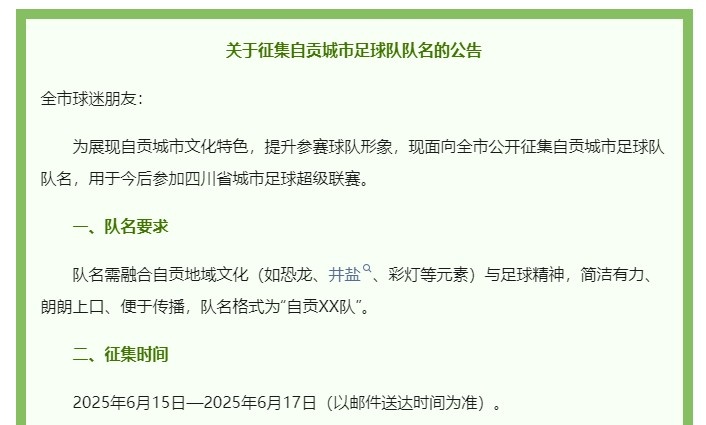 6月16日讯 据澎湃新闻报道,四川自贡市教育和体育局自6月15日起向全市公开征集自贡城市足球队队名,用于今后参加四川省城市足球超级联赛。...