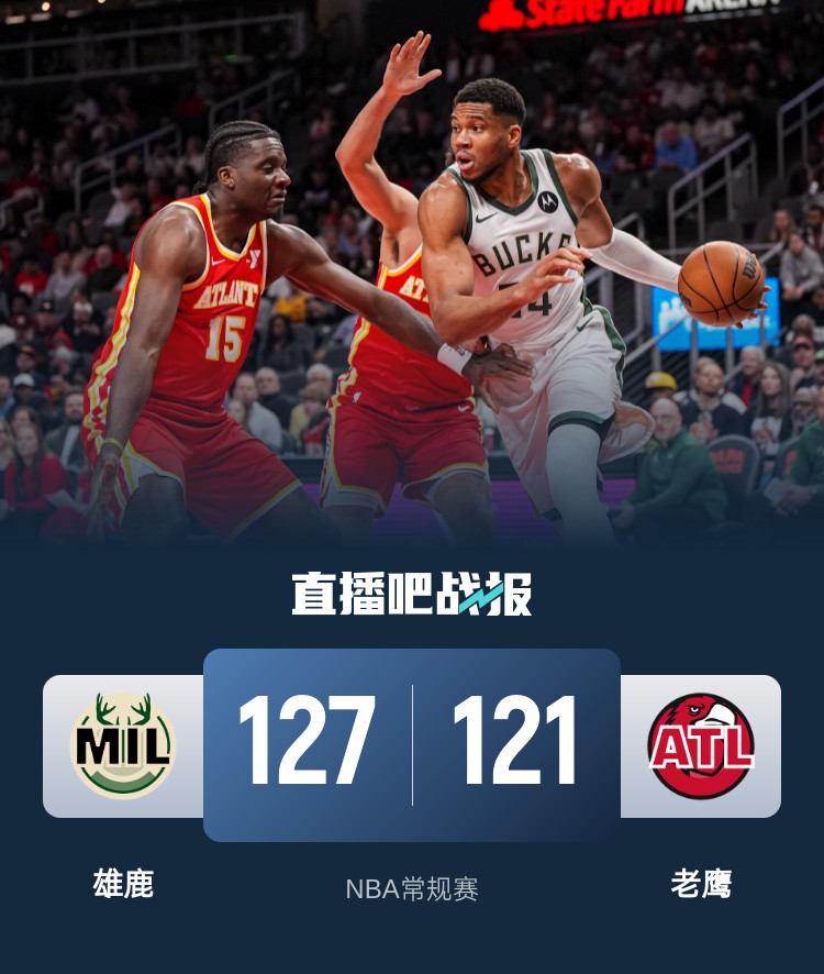 比赛开始,双方开场大打对攻,利拉德内外开花,特雷-杨得分助攻一肩挑给出回应,次节老鹰加强防守利用反击打出10-0的攻击波,利拉德和字母哥联手拿分稳住局势,半场战罢双方战成66-66平。易边再战,两队继续对攻,字母哥冲击内线,老鹰多点开花还以颜色,末节双方争夺陷入白热化,比分交替领先,关键时刻利拉德得分助攻一肩挑带队确立优势,老鹰苦苦追赶无果。最终,雄鹿127-121力克老鹰,客场过关。