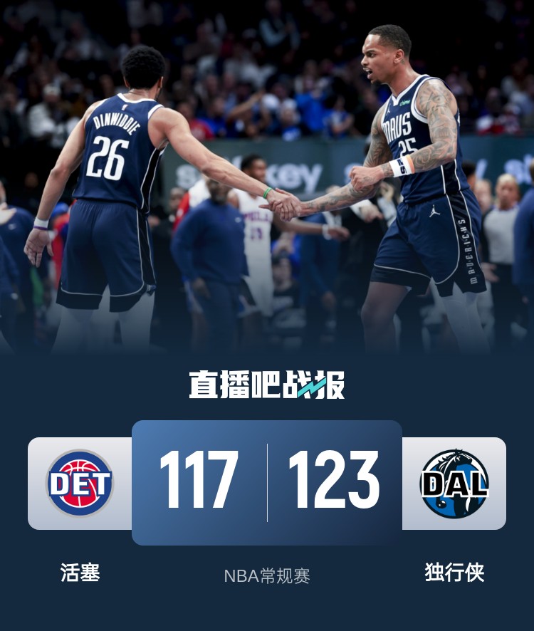 比赛开始,双方都迅速进入状态,独行侠连续外线4记三分占据主动权,比斯利和施罗德能给出回应,活塞10-2咬住比分,马绍尔连砍6分助队首节领先8分,次节双方展开拉锯战,杜伦依然能内线吃饼,霍兰成为奇兵单节上双,独行侠全民皆兵回应半场继续领先6分。下半场,活塞开始追分,比斯利连续外线三分一度追到差3分,但马绍尔连续抛投命中,独行侠一波小高潮重新掌握主动权,末节独行侠扩大至双位数领先,但活塞始终不放弃,施罗德和比斯利接连三分继续保持悬念,但独行侠还是保持两球以上领先,布兰登-威廉姆斯上篮2+1杀死比赛,最终独行侠123-117击退活塞,终止4连败。