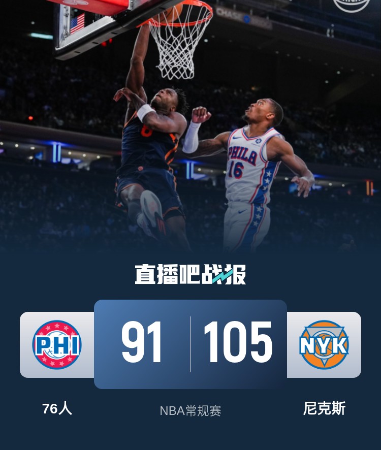 上半场,尼克斯率先发力,连投带罚很快取得两位数领先,76人不断冲击篮筐频频得手迅速追赶,尼克斯内外开花稳住局势,次节76人命中率骤降,尼克斯稳扎稳打不断扩大领先,阿努诺比高效输出,半场战罢尼克斯59-42领先76人。下半场,76人奋力反击追到只差5分,尼克斯连中三分稳住局势,末节尼克斯轰出15-4将分差拉开到20分以上,76人大势已去无力回天。最终,尼克斯105-91击败76人,主场过关。