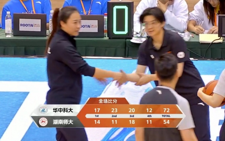 最后一节,高琳昕率先拿到两分,华中科大命中率也开始下降,但他们多次拼抢到前场篮板,两队防守强度都比较大,得分都比较困难,多次制造犯规获得罚球,华中科大始终保持两位数优势。全场比赛结束,华中科技大学72-54击败湖南师范大学。