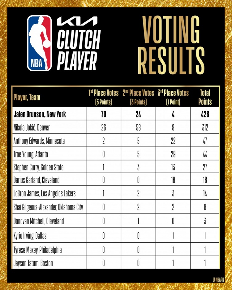 约基奇获得26张第一选票,58张第二选票,8张第三选票,总得分312分。