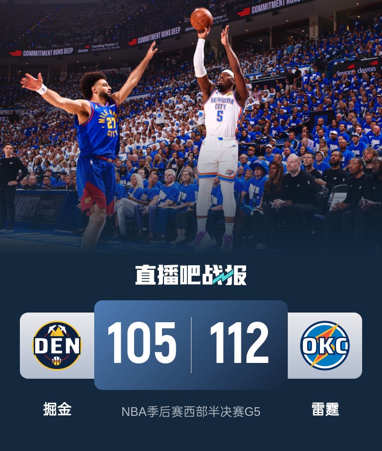 比赛上来,雷霆就率先进入状态轰出12-2的完美开局打停掘金,调整过后的掘金连续在篮下强攻及时追上比分,他们也在本轮系列赛第一次领先结束首节,次节掘金继续坚持禁区作战并获得一定优势,好在是雷霆连中三分完成止血,前两节的单节得分完全一样,半场结束时掘金领先2分;下半场回来,约基奇继续自己的出色表现,在他的带领下掘金也是将分差拉开到两位数,末节多特突然站了出来,不擅长投射的他连中三记三分球帮助雷霆一波抹平分差,关键时刻杰伦威和亚历山大连中三分杀死比赛,最终雷霆力克掘金夺下天王山。