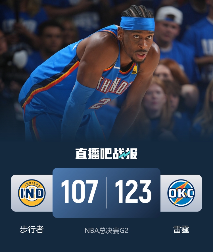 比赛开始,双方开场便陷入缠斗,亚历山大传射建功,步行者多点开花给出回应,卡鲁索和马瑟林对飙三分,步行者外线开火一度反超,雷霆攻防两端发力轰出11-0的攻击波确立优势,麦康纳三分止血,雷霆火力全开轰出19-2的进攻狂潮一举将分差拉开到23分,步行者及时回暖打出10-0缩小分差,亚历山大得分助攻一肩挑稳住局势,半场战罢雷霆59-41领先步行者。易边再战,双方连续出现犯规,各自频频通过罚球拿分,卡鲁索高效输出内外开花,雷霆稳扎稳打保持20分左右领先,内史密斯连中三分苦苦支撑,末节雷霆多点开花牢牢占据场上主动,哈利伯顿连续拿分但为时已晚,步行者大势已去无力回天。最终,雷霆123-107击败步行者,总比分扳成1-1。