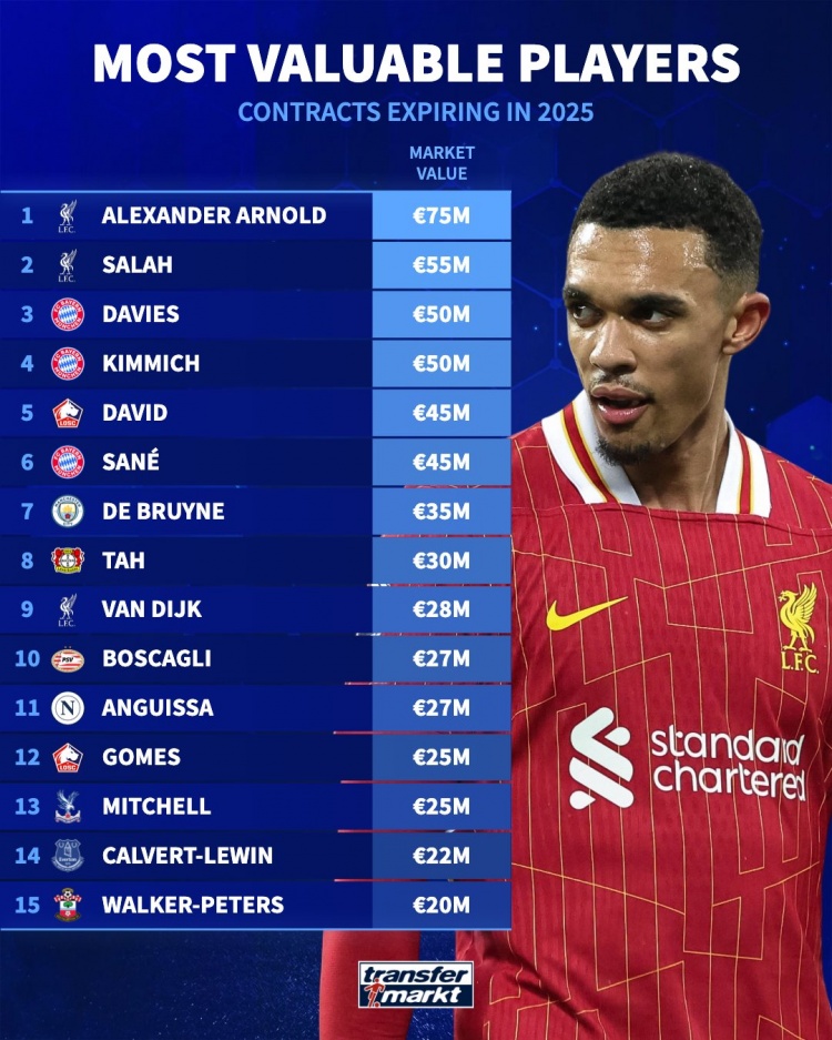 合同年球员身价榜:阿诺德7500万第1,萨拉赫第2,基米希丁丁在列