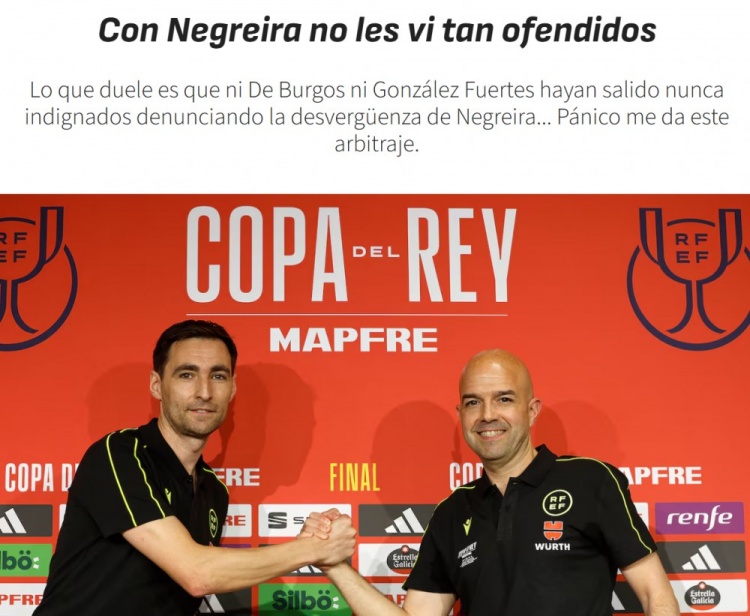 同样令人费解的是,当四倍支付内格雷拉酬劳的巴萨主席拉波尔塔上赛季公然宣称“联赛已被操纵以偏袒皇马”时,这两位裁判也未曾表露丝毫愤怒。相比起一家面向皇马群体的私人频道指控裁判存在倾向性判罚,难道一位即将在决赛中接受嘘声的俱乐部主席宣称“你们通过裁判决策操纵比赛”不是更为严重的指控?