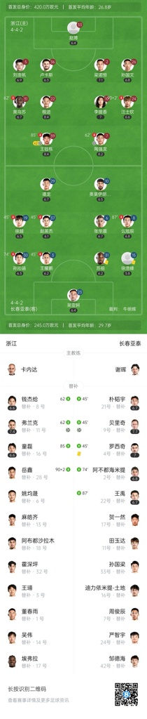全场比赛结束,浙江队4-2击败长春亚泰。