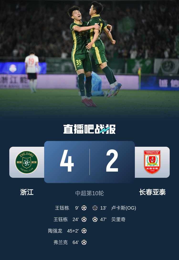 5月1日讯 北京时间5月1日19:00,中超第10轮,浙江队坐镇黄龙体育中心迎战长春亚泰。上半场,王钰栋小角度爆射破门,卢卡斯乌龙,王钰栋头球完成梅开二度,陶强龙传射;下半场,贝里奇扳回一球,程进第三次送上助攻,弗兰克破门。最终,浙江队4-2击败亚泰取得两连胜,积15分升至第6位,亚泰积5分排在第15位。