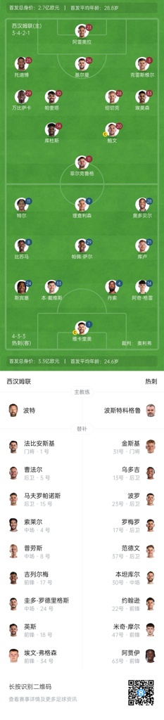 西汉姆联首发:23-阿雷奥拉、3-克雷斯维尔、25-托迪博、26-基尔曼、29-万-比萨卡、33-埃莫森、10-帕奎塔、14-库杜斯、20-鲍文、28-绍切克、11-菲尔克鲁格