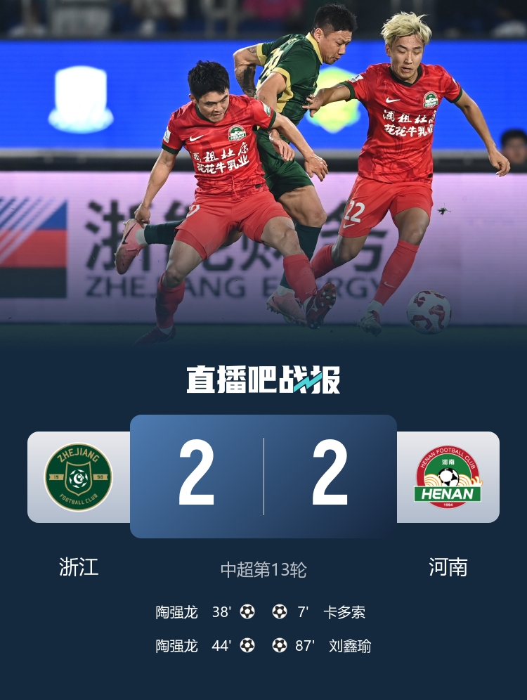 5月16日讯 北京时间5月16日晚19时35分,2025赛季中超第13轮在浙江省黄龙体育中心展开角逐,浙江主场迎战河南。上半场卡多索贴地斩,陶强龙5分钟双响反超+赛季第4球,弗兰克两助攻,黄紫昌伤退,下半场纳萨里奥中框,刘鑫瑜替补绝平,卡多索传射。最终浙江主场2-2战平河南,浙江联赛3轮不胜+2负1平,河南近5轮仅1胜。积分榜方面,浙江积16分位居第7,河南积11分升至第13,领先降级区4分。