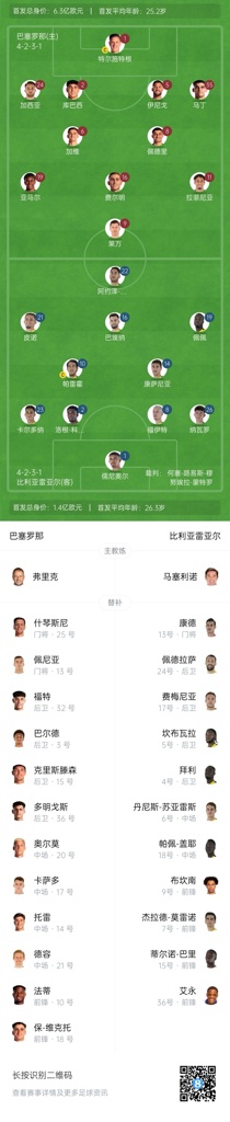 巴萨首发:1-特尔施特根、2-库巴西、5-伊尼戈-马丁内斯、24-埃里克-加西亚、35-杰拉德-马丁、6-加维、8-佩德里、16-费尔明、11-拉菲尼亚、19-亚马尔、9-莱万