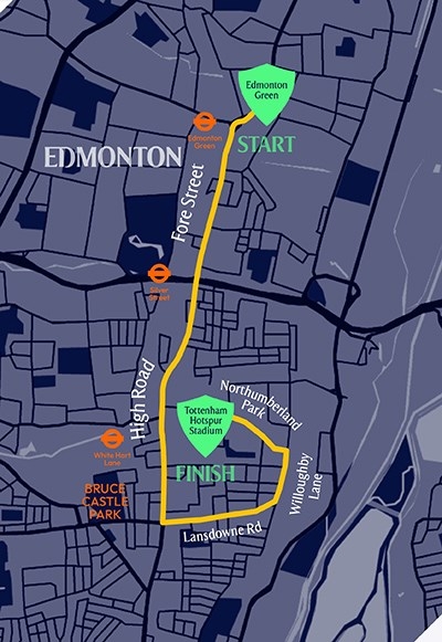 整个巡游预计持续60-90分钟,终点设在诺森伯兰公园道Sainsbury's超市旁的球场服务区。