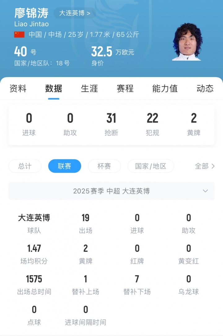 廖锦涛本赛季加盟大连英博足球俱乐部,至今已代表球队在各项赛事中出场21次,是球队的绝对主力。他在比赛中的出色发挥,赢得了俱乐部、教练组以及球迷们的一致认可。廖锦涛在场上跑动积极,覆盖范围广,有着出色的出球能力和阅读比赛能力,这使他成为球队战术体系中不可或缺的重要力量,为球队做出了显著贡献。更加值得一提的是,廖锦涛凭借本赛季的出色表现,首次入选国家队并完成首秀。
